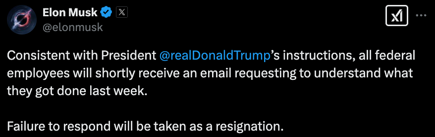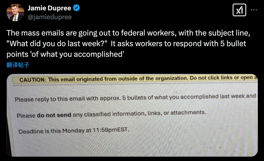 马斯克2月22日周六在社交媒体X上发出了这一特殊要求:“按照川普总统的指示,所有联邦雇员将很快收到一封电子邮件,要求了解他们上周都做了些什么。不回应将被视为辞职。”