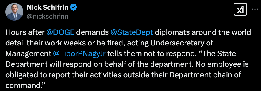 不久之后,联邦雇员——包括一些法官、法院工作人员和联邦监狱官员,都收到了一封三行电子邮件,上面有这样的指示:“请回复这封邮件,用大约5个要点说明你上周完成的工作,并抄送你的经理。”