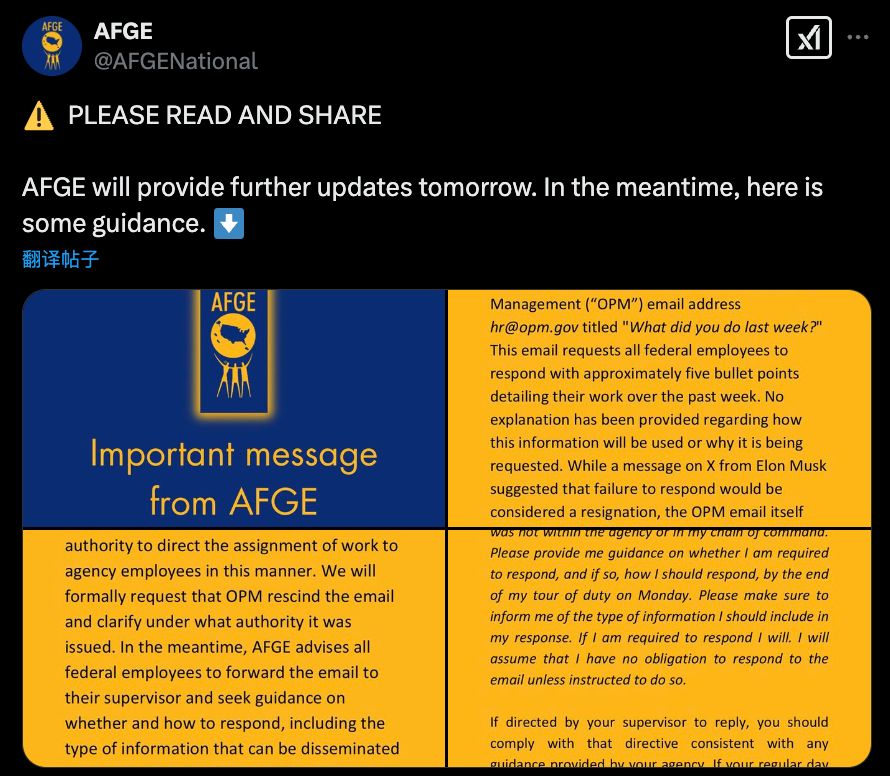 美国人事管理局 (United States Office of Personnel Management)发言人McLaurine Pinover证实了马斯克的指示,并表示各机构将“决定下一步的行动”。