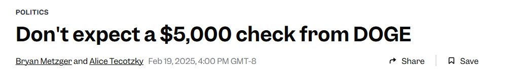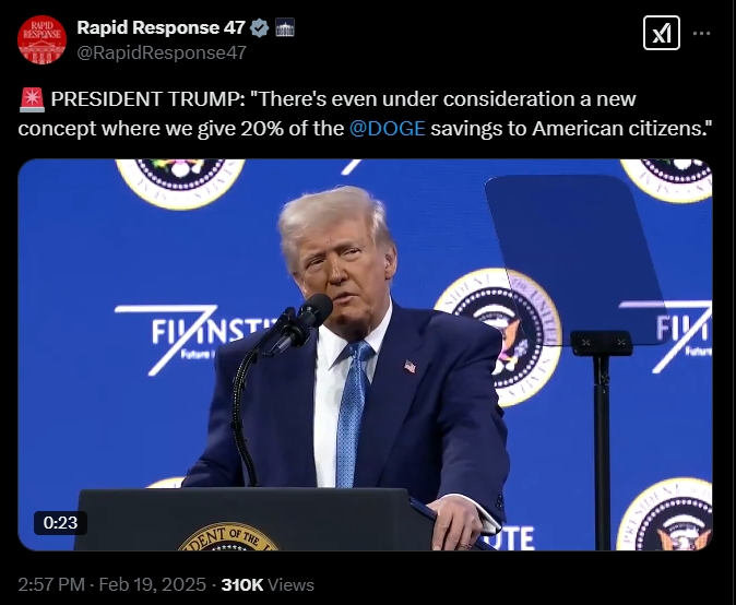 一天后,川普在迈阿密出席投资会议时证实,政府正在考虑这样一个构想:将DOGE削减成本所节省的资金的20%分配给美国公民,另外20%用于偿还国债。川普还表示,分红的可能性将激励人们举报浪费性支出。