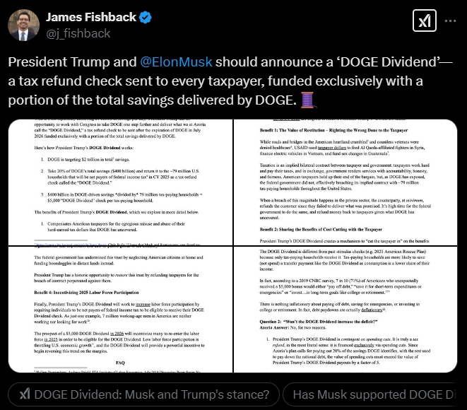 随后,社交媒体X用户、投资经理James Fishback写了一篇文章,并标记了马斯克,提议将DOGE节省下来的20%资金以退税支票的形式发放给辛勤工作的美国人,“这本来就是他们的钱!”