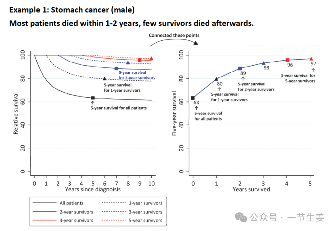 以男性胃癌为例,最初的5年生存率只有63%。但是对于已经生存了5年的患者,5年生存率就升高至97%!(相比之下,总体上男性胃癌的10年生存率为61.3%)