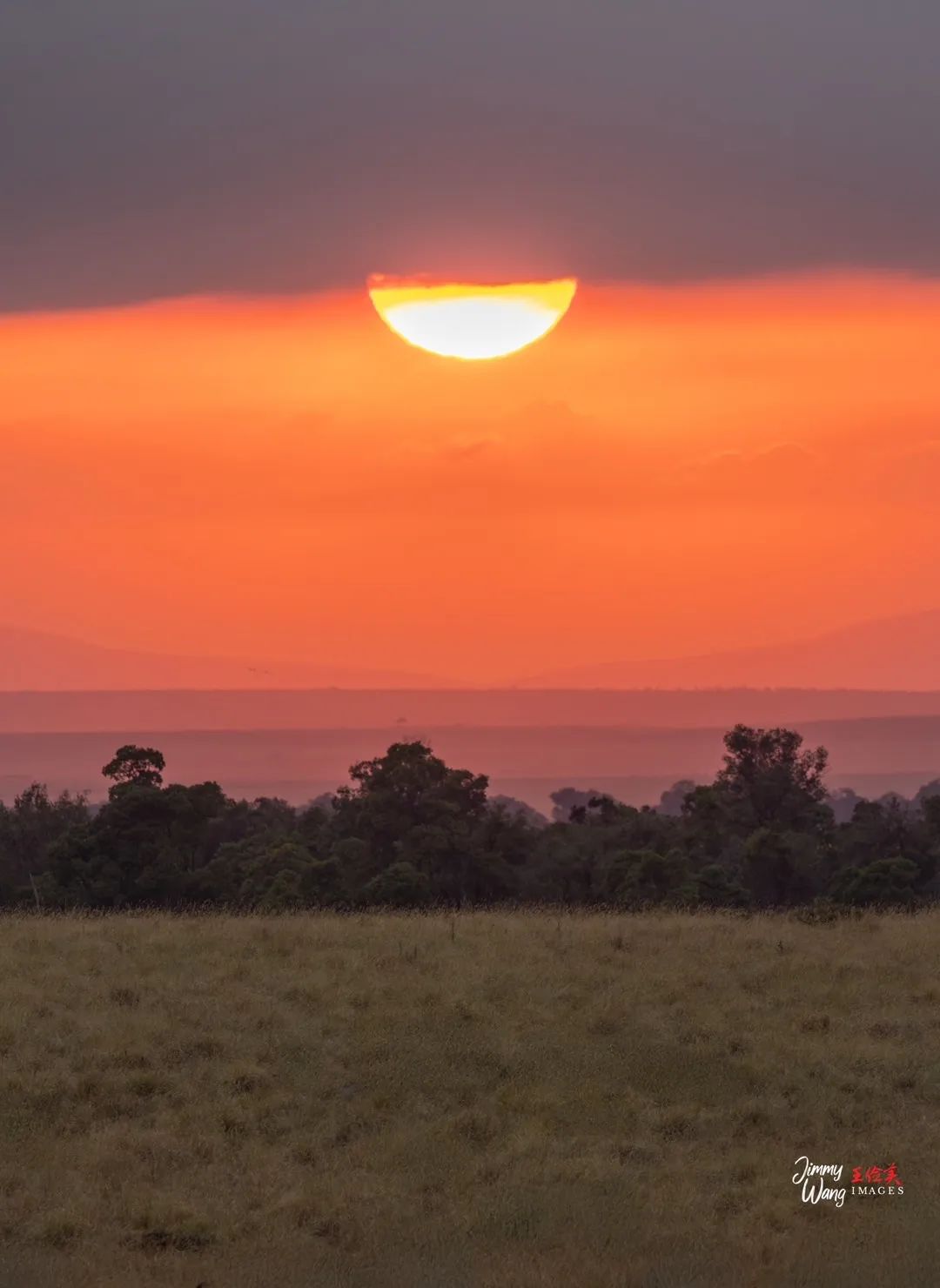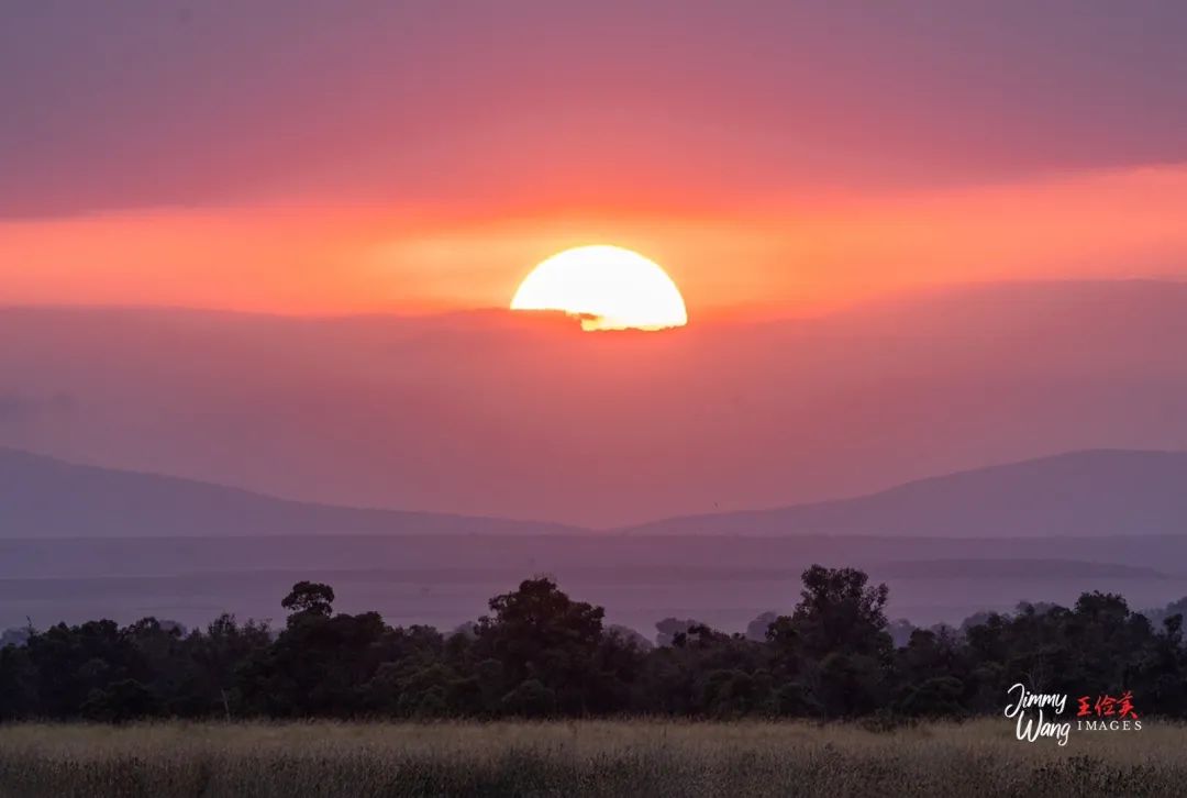 其实,是同一片草原、同一个太阳,因为在不同的时段,与不同的自然风光搭配,与不同的树木玩耍,就有了色彩、形状不同的太阳。