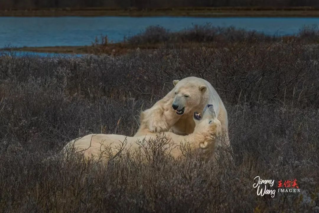 两只北极熊呲牙咧嘴,正在枯黄的杂草间玩耍打闹,背景是一缕幽蓝的湖水,彰显地球极北、苦寒之地的氛围。Two polar bears are playing on the withered weeds, with a backdrop of deep blue lake water, evoking the harsh and cold atmosphere of Earth's northern region.