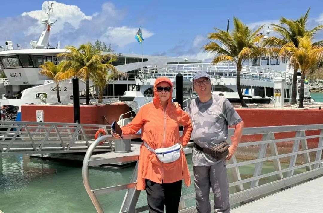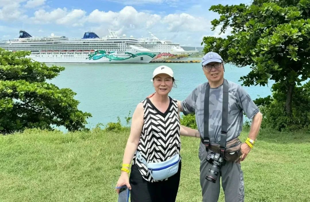 王俭美、潘平微在港口与游轮合影