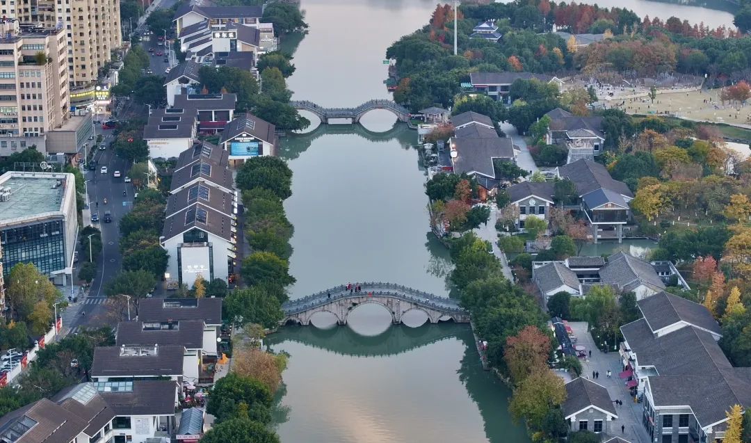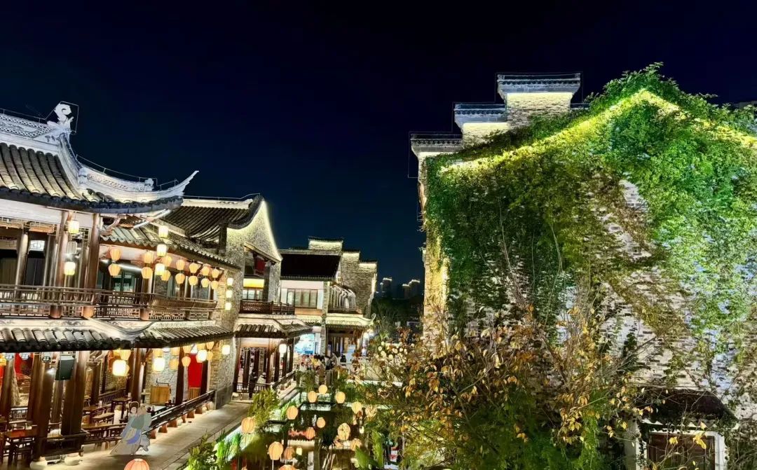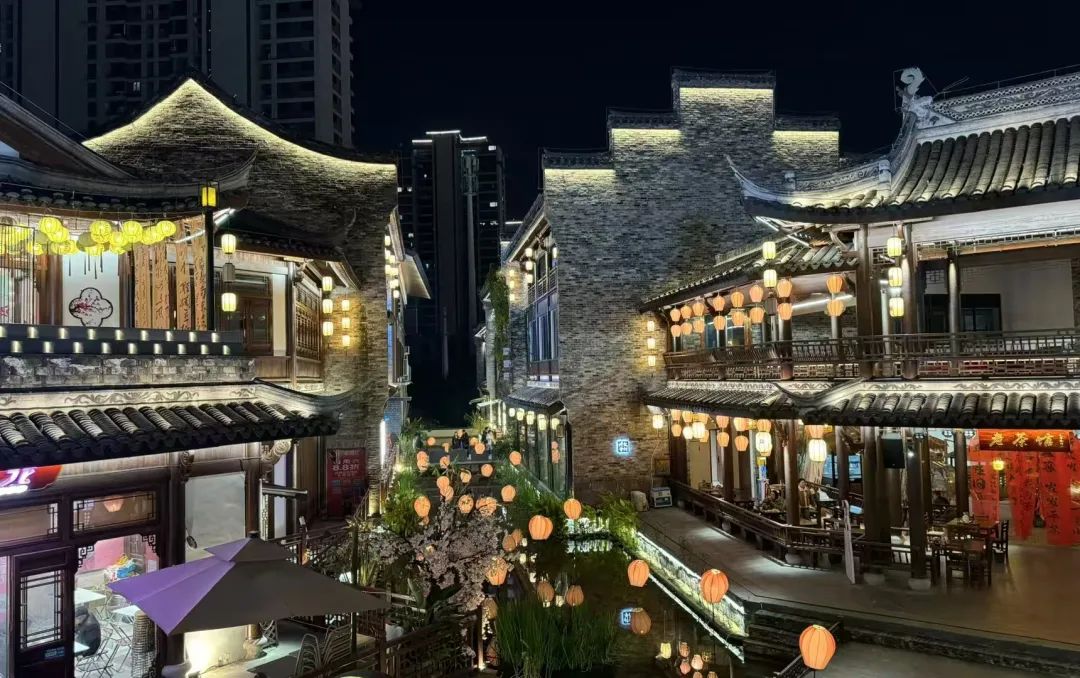 图3-5:南塘水域,清澈的河流悠然穿越座座桥梁,在晚霞与灯光的交相辉映下,两岸的高楼大厦与古朴的民宅瓦房展现出别样的璀璨。
