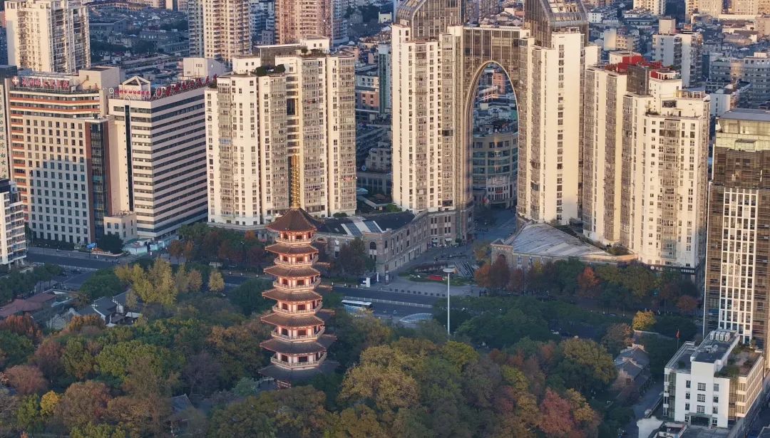 图8-9:背景中,“大裤衩”新国光大厦巍峨矗立,成为视觉焦点,前景则是著名风景名胜松台山的净光塔,两者相映成趣,诉说着传统文化与现代文明的完美交融。