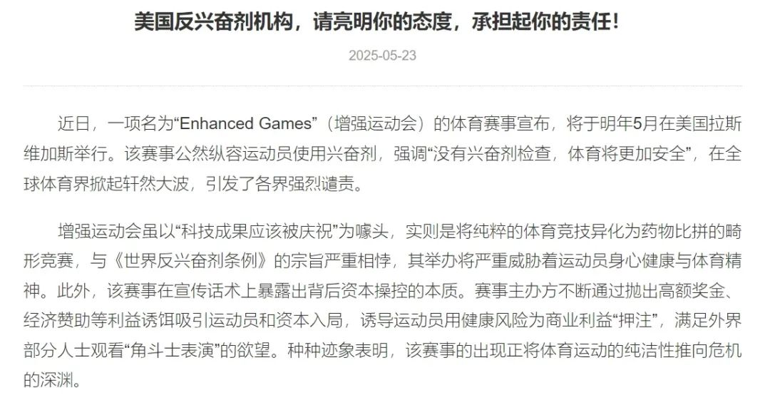 中国反兴奋剂中心更在声明里表示,赛事发起者是在“诱导运动员用健康风险为商业利益‘押注’,满足外界部分人士观看‘角斗士表演’的欲望”,将体育运动的纯洁性推向深渊。