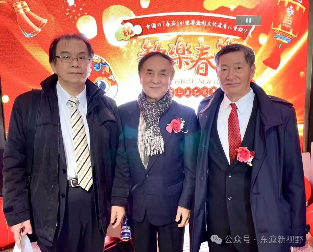 旅日专家学者王海峯(中)与侨领王艺武(左)、王自祥(右)在“2025大阪春节祭”现场