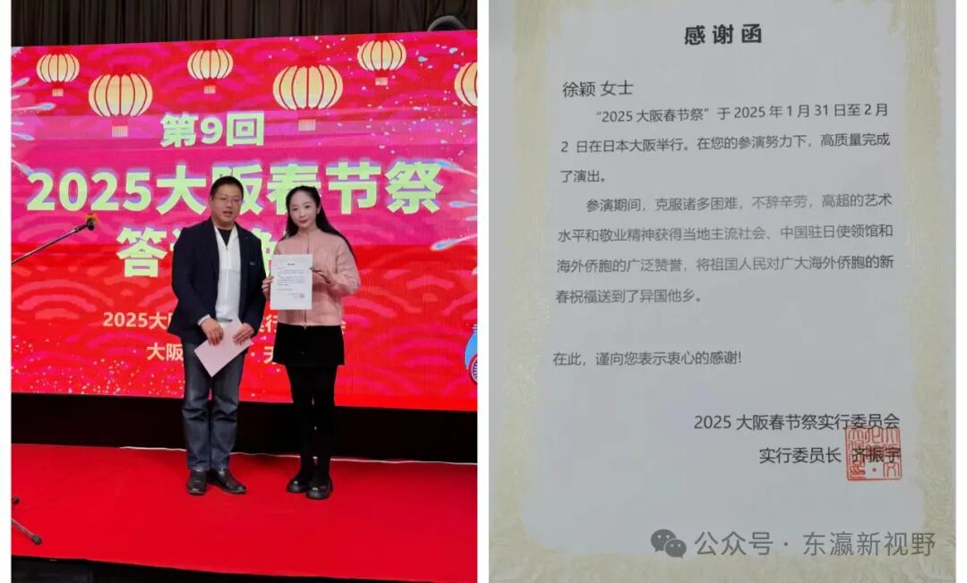 “大阪春节祭”连续三天的演出,在徐颖的精心组织和周密安排下,武昌理工学院5位老师的精彩表演不仅为当地华侨华人带来了家乡的温暖,也向日本民众乃至全球游客展现了中日文化交融的独特魅力;同时也得到了主办方负责人,大阪文化馆·天保山理事长张永胜等的充分肯定和高度赞赏,充分展现了中国高校教师的艺术素养与专业水准,彰显出武昌理工学院教师扎实的艺术功底。为此,“2025大阪春节祭”执行委员长、日本华侨华人社团联合会副会长齐振宇还专门向徐颖等5位武昌理工学院的老师颁发了“感谢函”。