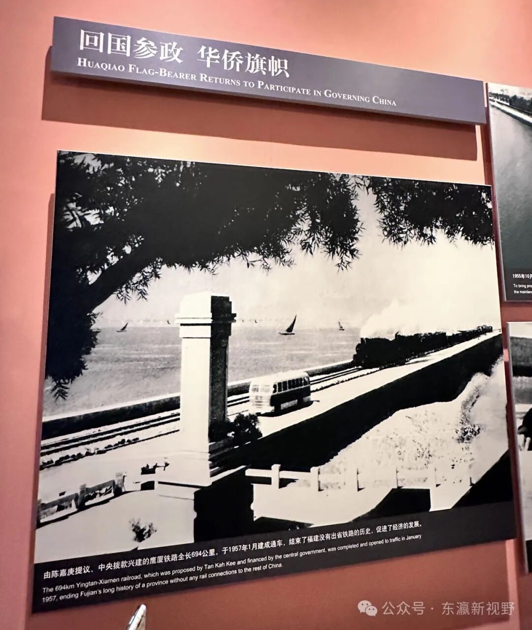 福建被称为“八山一水一分田”,从古到今,除了海运,出省的交通都十分不便,直到1949年新中国成立前除了昙花一现的漳厦铁路 ,整个福建在铁路交通上可以说一片空白。但1955年2月21日开工、1958年1月3日正式运营的的鹰厦铁路(江西省鹰潭市至福建省厦门市),却改变了历史,成为福建省第一条干线铁路、第一条出省铁路通道,也是中华人民共和国成立后继成渝铁路后第二条开工建设的干线铁路。而这条铁路的建成,也离不开陈嘉庚的贡献。上面这张照片,清楚地记载了由陈嘉庚提议,中央拨款兴建了这条全长694公里的铁路。