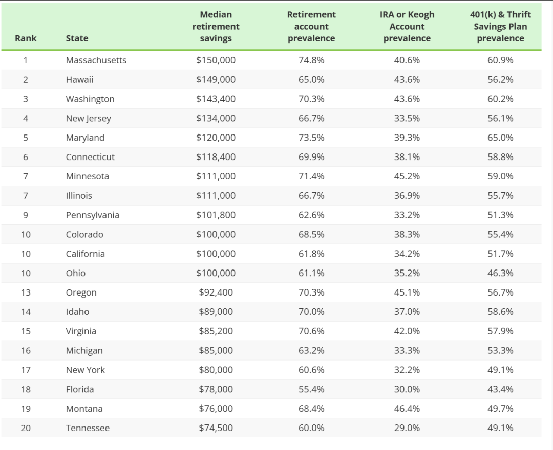 来看看各州的退休存款排名👇