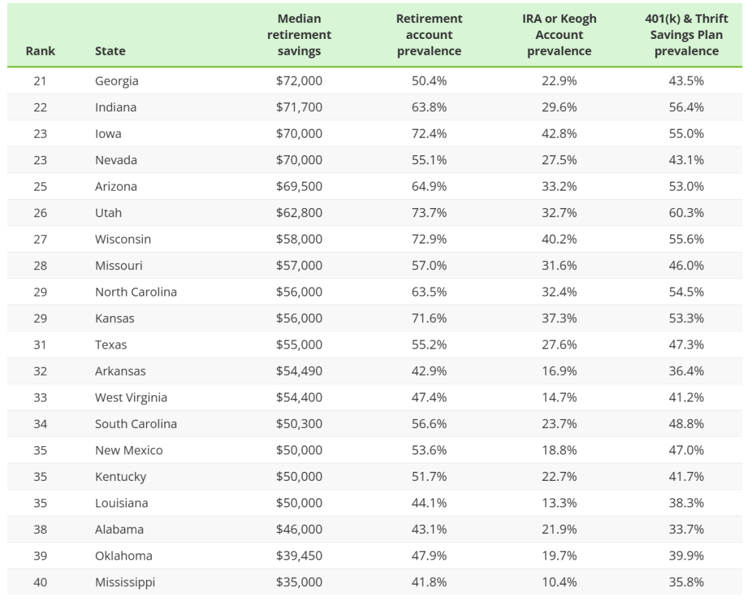 基于这些数据,SmartAsset对全美40个州进行了排名,比较内容包括平均家庭退休储蓄、与收入的对比、各类退休帐户使用情况。