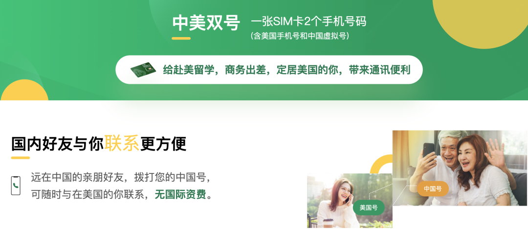 迎客移动一张SIM卡中含有2个手机号码,一个美国手机号,一个中国虚拟手机号,中国虚拟号可用于接收来自中国的电话、短信、验证码,无国际资费。并且可以免费使用美国境内以及中国大陆、中国香港和中国澳门的国际通话。从此,距离再也不是阻碍交流的屏障,天涯海角,我们都能与亲人通话。