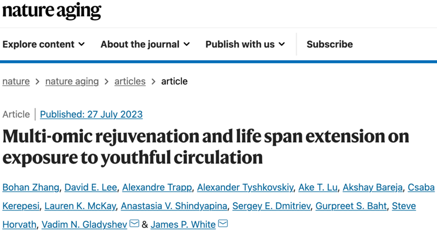 [1] Zhang, B., et al., Multi-omic rejuvenation and life span extension on exposure to youthful circulation. Nature Aging, 2023.