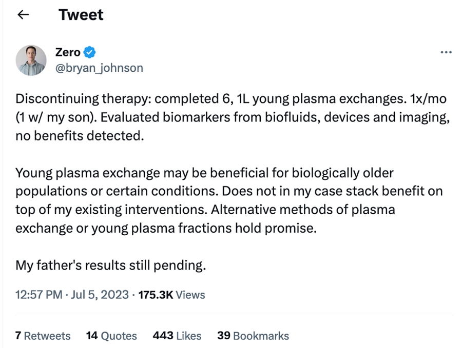 3. 富豪布莱恩的“换血”与老鼠试验中采用的异种共生技术并不一样。虽然老鼠换血的试验成功了,但是人类通过换血而延年益寿还不是现实。“共生换血”的操作还存在风险,不应盲目地“吃螃蟹”。 《自然·衰老》重磅研究:老鼠换了童子血,延年益寿大获成功但仅三周后,7月27日,《自然·衰老》杂志发表了一份令人震惊的研究结果:杜克大学医学院James P. White和哈佛医学院Vadim N. Gladyshev的研究团队宣布:给老年鼠换了幼年鼠的血液之后,老年鼠的寿命真的延长了[1]。具体的数据是:与不换血的老鼠相比,换过血的老年鼠寿命中位数延长了6周。 换血的操作,是所谓的异种共生(HPB)技术,也就是将老年鼠和幼年鼠的血液循环系统连接在一起。之前的试验,是连续换血5周[2],而在《自然·衰老》这份最新的研究中,是3个月。 ▎异种共生换血试验。3个月的换血,不但把老鼠的寿命延长了,很多生理指标都改善了,比如血液和肝脏的表观遗传学年龄大幅降低,全身基因转录组和表观基因组图谱也偏向了年轻化。 ▎换血3个月,老鼠寿命延长6周。据了解,这是科学家首次证实,将年老小鼠血液循环接入年轻小鼠的血液循环,可以延长寿命!这应该是一个振奋人心的消息,尤其对于老龄化越来越严重的世界。 美国科技富豪布莱恩·约翰逊:“换血”为何没有给自己带来任何好处? 老鼠的试验成功了,人体试验的成功还有多远呢?《自然·衰老》上所报道的老鼠换血试验,并不是历史上首次;因为之前也报道过换血5周的老鼠试验,而且从某些生理指标上看,老鼠可以达到“延年益寿”的效果,因此就有勇敢的人开始尝试“吃螃蟹”。美国科技富豪布莱恩·约翰逊就是一个吃螃蟹的人。 30岁的时候,布莱恩·约翰逊创办了线上支付平台Braintree; 35岁的时候,布莱恩·约翰逊的公司以2620万美元收购了美国人常用的线上支付平台Venmo;36岁的时候,布莱恩·约翰逊的公司被PayPal以8亿美元收购。 年轻时,用生命挣钱;有钱了,用钱换生命。布莱恩·约翰逊就是一个活生生的例子。作为“修仙达人”,布莱恩·约翰逊每年要花至少200万美元,拥有一个由30多位医生组成的健康管理团队,尝试各种最先进的抗衰老方法,遵循严格的饮食、睡眠和锻炼指导,日夜监测身体的机能和老化程度。布莱恩·约翰逊的目标:让身体的器官回到18岁!布莱恩·约翰逊自然不会放过换血。实际上,布莱恩·约翰逊的一家都不会放过换血!根据报道,布莱恩·约翰逊与17岁的儿子塔尔马奇、70岁的父亲理查德一同到了美国得克萨斯州达拉斯的一家叫做Resurgenc Wellness的诊所参与“换血”。当然,布莱恩·约翰逊的“换血”与老鼠试验中采用的异种共生技术还是不太一样。布莱恩·约翰逊的“换血”,是将年轻者的血浆注射到年纪大的人体内,其实只是“输血”,并没有像异种共生技术那样将两者的血循环系统直接相接。结果呢?7月5日,布莱恩·约翰逊在社交媒体上宣布:放弃换血!因为没有看到这个极端的方式给自己带来什么好处。在放弃之前,布莱恩·约翰逊已经进行了6次“换血”,每次换1升血浆,每个月进行1次,其中1次的血浆来自自己的儿子。▎根据布莱恩披露消息,他们进行换血过程并非从一个人体内抽出血后,立即注射到另一人的体内。而是首先要把抽出的血液通过机器分离成血浆、红血球、白血球以及血小板。▎在传统医学中,血浆输注用于治疗多种疾病,包括肝病、烧伤和血液疾病。在 Covid-19大流行期间,血浆交换进入主流话题。尽管世界卫生组织在2021年建议不要这样做,但一些新冠肺炎患者被注射了从疾病中恢复并在系统中显示出抗体的人的血浆。老鼠换血“返老还童”的试验到底有何意义?我们能找到真正的年轻因子吗? 布莱恩·约翰逊的“换血”虽然失败了,但是如今根据《自然·衰老》杂志的报道,老鼠换血的试验成功了,是不是说,布莱恩·约翰逊的“换血”搞错了方式,如果按照真正的共生技术的换血方式,也会获得成功呢?贫穷限制了我们的想象力,有钱就可以任性,就可以打开格局。不能排除有其他富豪想尝试“共生”换血的可能性。但是,在盲目“吃螃蟹”之前,我们应该再来仔细分析一下老鼠试验的效果。在这个试验中,年老鼠和年轻鼠血管相连“共生”了3个月,然后寿命平均提高了6周(或者说一个半月)。请注意,这是平均数,如果比较最长的寿命,换血只提高了两周。也就是说,对于一个本来寿命可以比较长的老鼠,“换血”的获益可能更为有限,但同时“换血”这种操作带来的风险并不会减少。老鼠的1周,可以简单地折算成人的1年。如果老鼠的结果可以平行推论到人类,那么要获得6年寿命的延长,需要进行12年的换血共生技术。在这12年的时间里,年老的富豪需要每时每刻都跟一个年轻的人血管相连。▎长期的抗衰老试验,让布莱恩·约翰逊的新陈代谢迟钝,肠道蠕动被抑制,或者说失去了“排便”的能力。这张公开的图片,表明他就是这样排便的。看到他身下的那根管子了吗?要靠纯粹的吸力来帮助排便。有钱人可以买年轻人12年的时间,但是有钱人愿意牺牲12年的隐私,跟一个年轻人捆绑在一起吗?哪怕是有先进的换血技术,让共生不影响其他的生活?关键是,这12年的牺牲,也并不是让身体的器官回到18岁,只是获得6年的延长!所以,即便有钱人在12年后重新换一个年轻人,但是终究很快会达到“钱还有,人没了”的结果