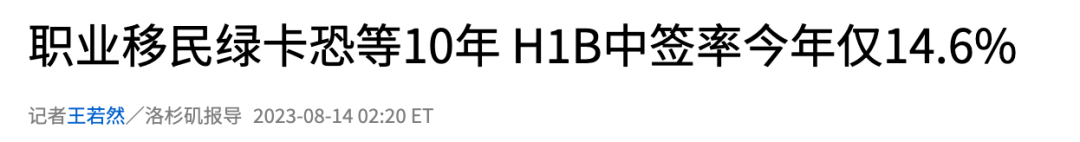 其实让想要留美的中国留学生崩溃的不只10年排期,还有历史新低的工作签证H1B中签率。H1B工作签证,是拿到绿卡前,维持可以工作的合法身分的最佳途经。许多职业移民申请者,都会先拿到H1B工作签证,再着手开始绿卡申请。根据美国移民局发布的数据,2023年H1B中签率仅为14.6%,虽然今年有第二次抽签的“”海底捞”,但综合中签率仍然很低。曾有华人6次参与H1B抽签都未中签。
