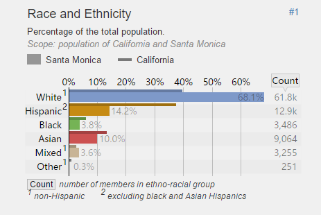根据最近美国人口普查数据,圣莫尼卡市有人口 90,752人,其中白人占68.1%,亚裔占:10%。