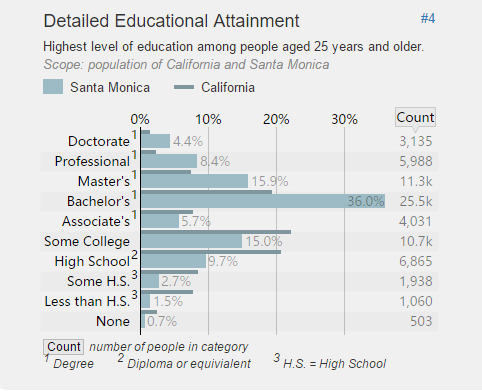 根据数据图二显示,圣莫尼卡居民拿到高中文聘以上的比例为85.4%,高中文聘以下(包括高中文聘)的比例为15.6%,其中拿学士学位的居民比例最高为36%,我们可以看出圣莫尼卡的人均受教育水平很高。