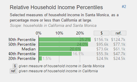 (Relative Household Income Percentiles=相对家庭收入百分比;Selected measures of household in Santa Monica, as a percentage more of less than California at large=选取圣莫尼卡居民的收入数据,与整个加州居民收入作比较;$given measure of household income in Santa Monica=圣莫尼卡家庭收入数据;ref.given measure of household income in California=加州家庭收入数据)