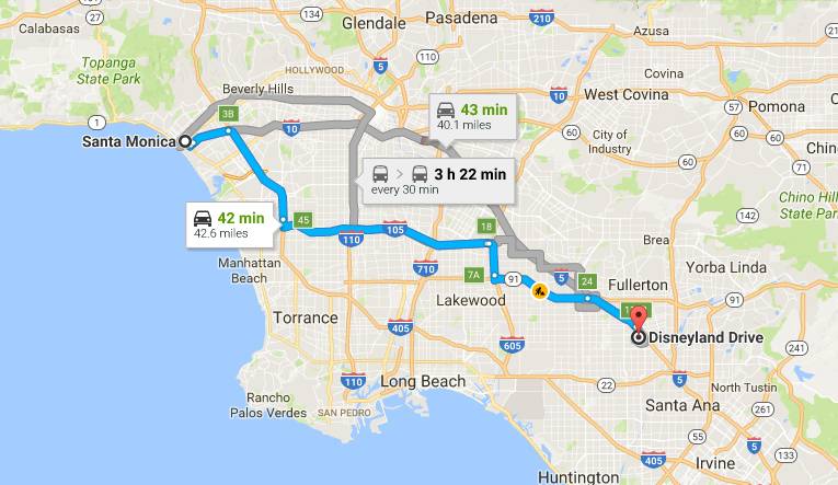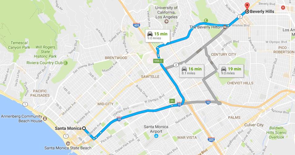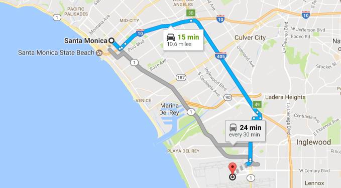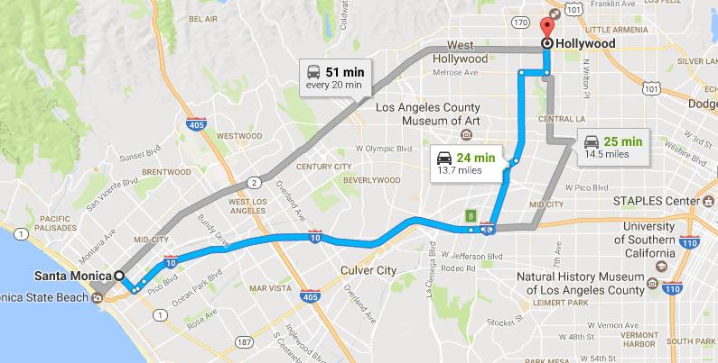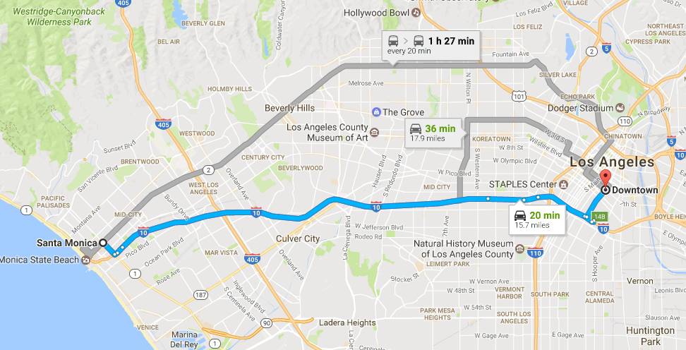 圣莫尼卡区域也同属于大洛杉矶县交通服务署内系统,地铁线和大蓝巴交通体系互补,洛杉矶市区通往圣莫尼卡的轻轨铁路于2016年初通行,该轻轨在圣莫尼卡26街,17街都有停靠站,圣莫尼卡市也有独立的机场——圣莫尼卡机场,从圣莫尼卡到比弗利山庄、好莱坞和洛杉矶国际机场也只需十几分钟车程,距离洛杉矶市中心仅15英里。