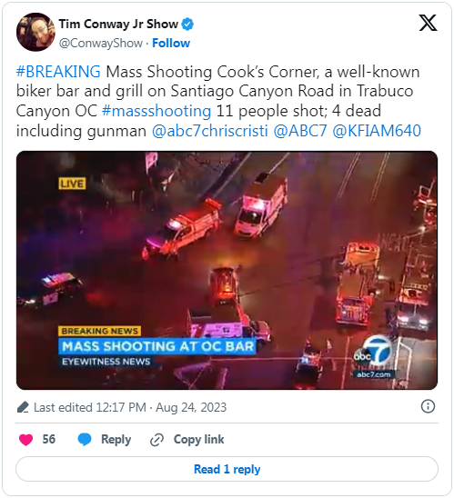 根据ABC7报导,位于橘郡圣地亚哥峡谷路(Santiago Canyon Road)一间的知名重机酒吧Cook's Corner在23日晚间传出枪响,现场多人中弹,目前已知有其中5人死亡、6人重伤送医。