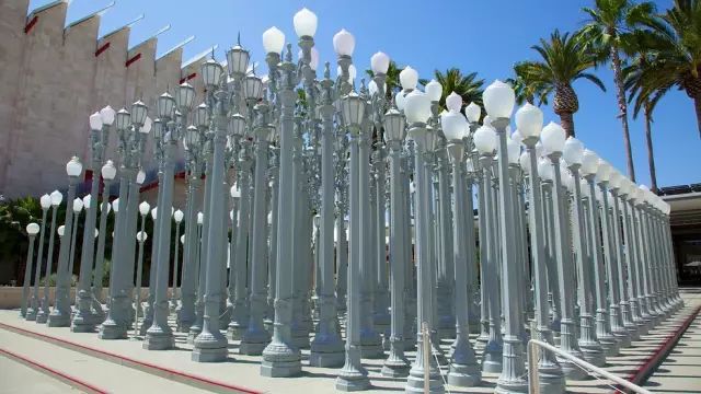 美术馆内除了有令人惊艳的艺术品外,LACMA的中央入口前广场更有着让人眼睛为之一亮的"Urban Light"。这些造型古典的街灯总共有202座,是一位收集狂人在跳蚤市场上一次偶然的买了第一盏街灯后,就不知不觉地收藏上瘾,之后再发挥自己的创意,将这些街灯漆成中性的灰色,以突显每盏灯独特的花纹和造型。因此在广场前的每个街灯都是最独一无二的古董。而现在已改造成太阳能发电,日落后会点亮整个广场,实在是一个相当瑰丽的公共艺术创作!