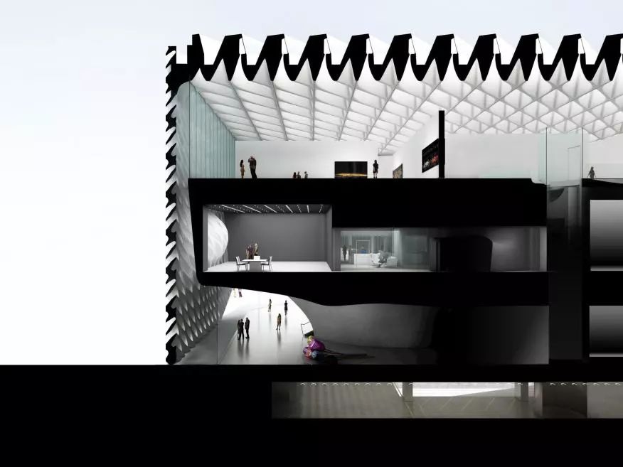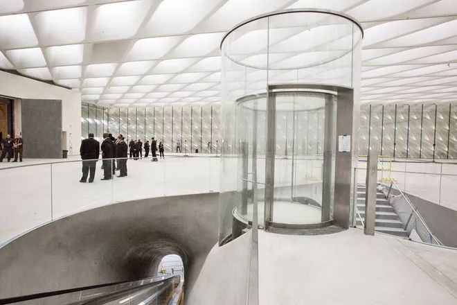 进入大厅后,游客将乘坐105英尺长的自动扶梯,穿过二楼的混凝土穹顶,到达三楼的美术馆。该美术馆天花板高23英尺,拥有318个天窗,自然光可以通过这些屋顶天窗散射进来。