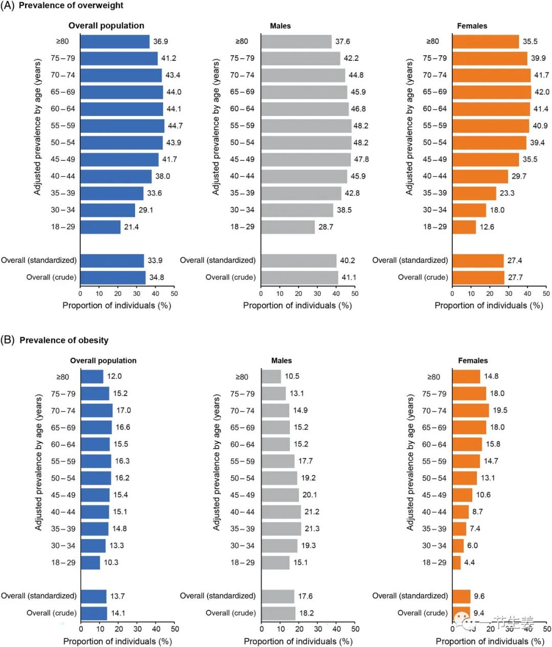 图:不同年龄、性别参与者的肥胖率和超重率(来自文献[1])
