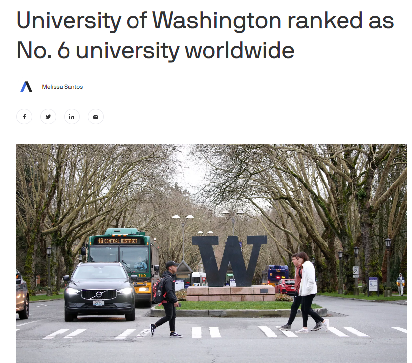 据Axios新闻11月2日报道华盛顿大学在全球大学排行榜中排名第6,超过了很多常春藤大学。