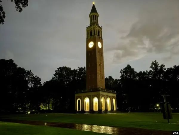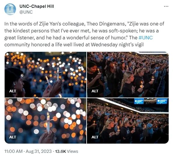 昨晚,数百名UNC学生聚集校园,用烛光纪念严教授。