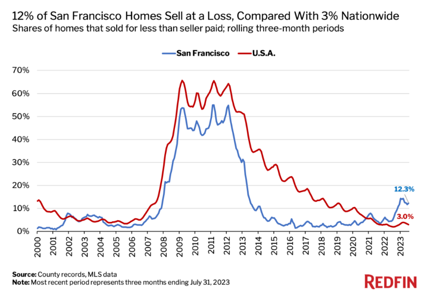 根据Redfin的数据显示,在截至7月31日前的三个月内,湾区售出的房屋中约有 12.3%(即八分之一)的购买价格低于卖家的购买价格。这一数字比去年同期增长了 5%,高于美国其他主要大都市,而且是全国出售房屋时遭受损失的房主 的四倍。