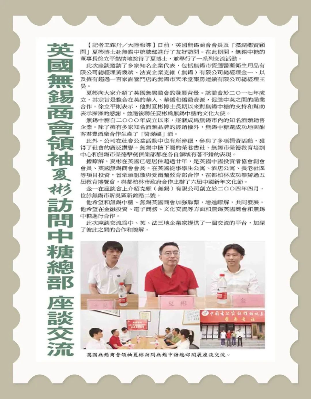 《台湾新生报》刊载无锡中糖董事长徐立平接待英国无锡商会会长夏彬博士等中、英、法企业家参访