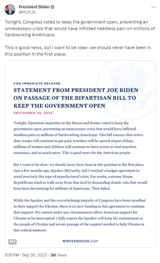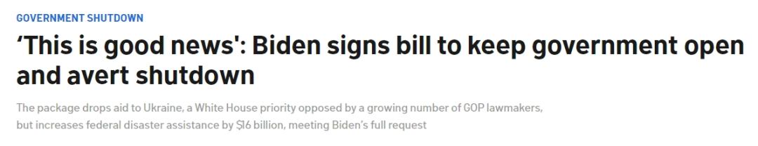 根据报道,临时拨款法案取消了对乌克兰的援助,这是白宫的优先事项,遭到越来越多的共和党议员的反对,但增加了160亿美元的联邦灾难援助,满足了拜登的全部要求。该法案为政府提供资金至11月17日。