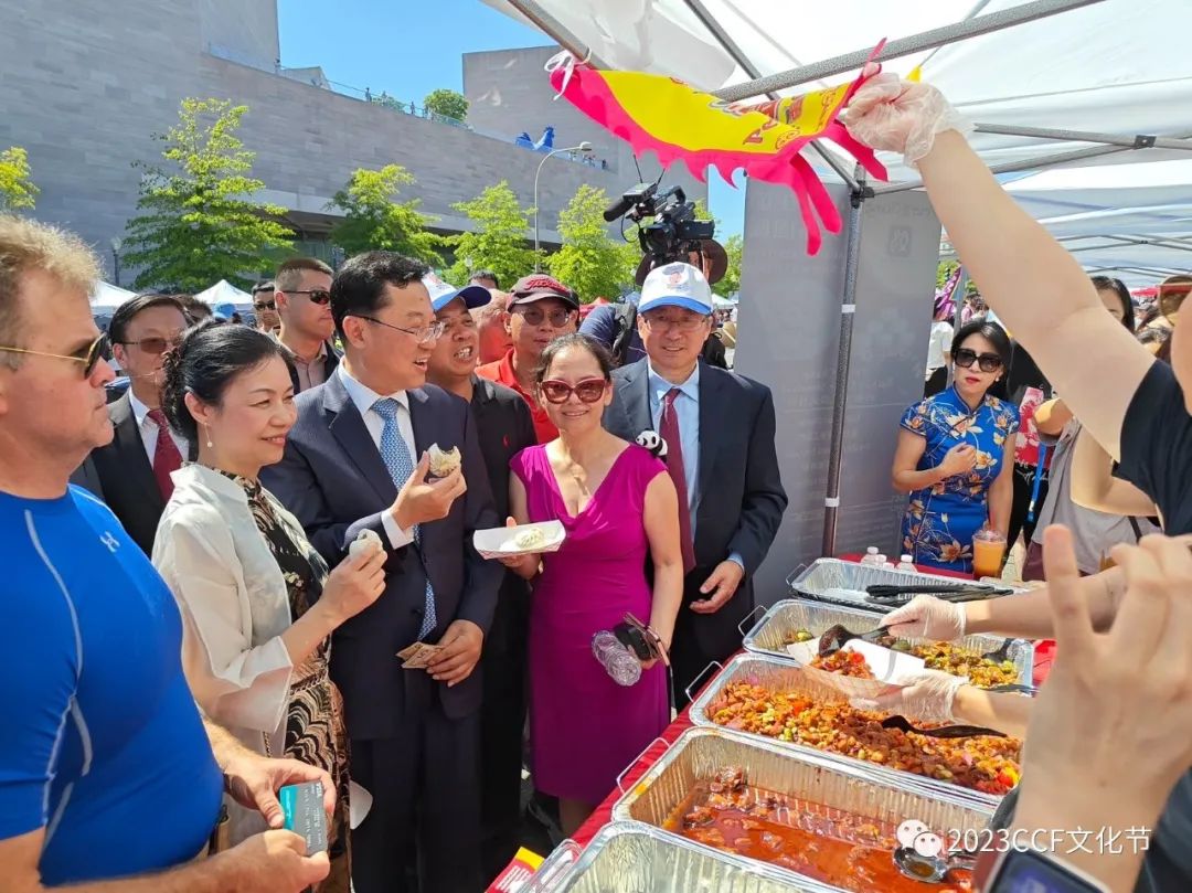 主办方一同参观中华美食小吃展区。谢锋大使及夫人品尝了Peter Chang美食摊位的烤鸭包,连声称赞“这个包子好吃,家乡的味道。希望在美国生活的朋友们也经常回到中国家乡去看一看。”