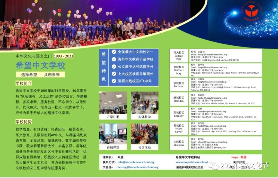 希望中文学校(HCS)成立于1993年,是非盈利组织语言学校,其宗旨是向大华府地区的各族学生及成人提供学习中文的园地,致力于发扬中华民族优秀传统,联结在美华人情谊,增进多元文化之间的交流与了解。