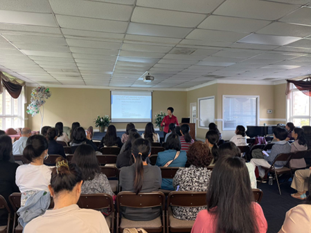 下午另外一场精彩的特邀嘉宾报告是由线上中文教学品牌Rita’s Chinese Academy的创建人、约翰·霍普金斯大学SAIS中文教师范书红老师带来的“从声调到句调——针对非华裔学生教授中文语音系统的一种可能性”。范老师首先提出了有关中文语音教学的几个根本性问题请与会者反思——“教发音重要吗?教师实际上用多大比例的教学时间进行中文语音教学?”“中文语音教学应该在哪个学习阶段进行?如何教?”“教发音就是教拼音吗?”随后,范老师详细讲解了中文语音教学的特点以及中文发音训练的具体内容和步骤,并着重强调了声调的教学,包括单个声调的教学应尊重语言事实、四个声调之间是一种相对关系、四声在组合中的相互影响及变调等。在句调方面,范老师指出音域的变化、音节之间的相对长短、音量的大小差异等决定了中文句子中的轻重音与整体节奏,而句调是使学生中文发音更加自然、富有感情的关键层面。范书红老师的报告从宏观入手,逐渐细化,深入浅出地为与会教师进行了一场系统化的中文语音教学培训。