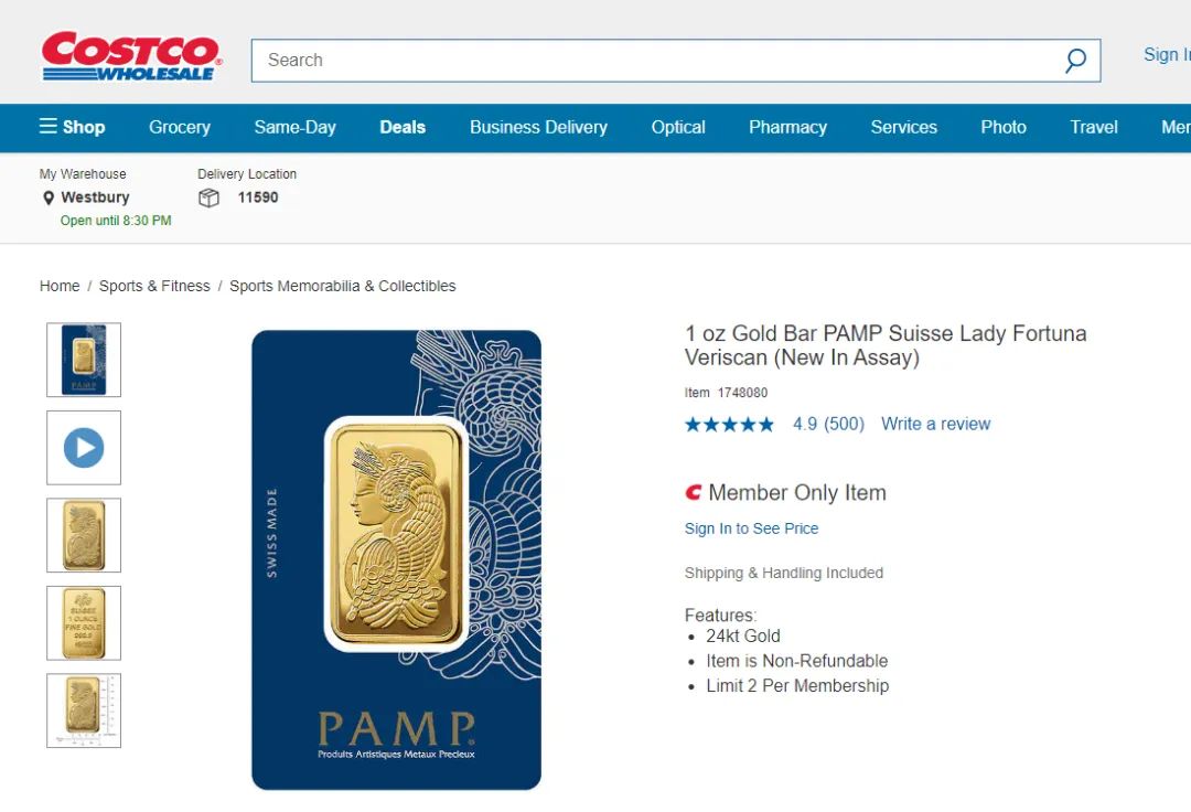 网站显示,Costco目前销售的一盎司24克拉金条产自南非的兰德精炼厂(Rand Refinery)以及瑞士PAMP铸币厂。这两种金条只对Costco会员出售,每人限购两个,且不可退款。