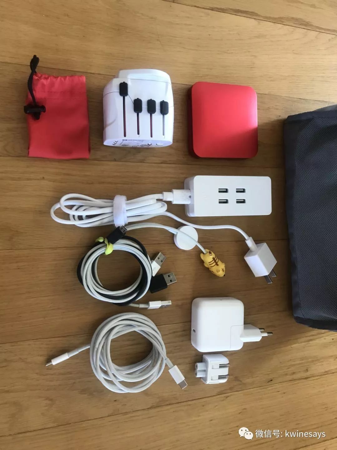 线束包里面,除了有一个全球转换插头之外,我会带有N个UBS插口的充电器,这样能一次充多个电子设备(我的电子设备不少,但我相信有人比我更多)。特别要强调的是,这些插头啊转换器什么的,质量一定一定要好,因为本来转啊、接啊就会给电路造成负担,质量不好会有很大的火灾隐患。