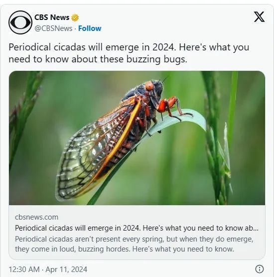 先前多名昆虫学者预测,美国中西部和东南部地区将在今年4月底,迎接2个不同族群、合计共有逾1兆只「周期蝉」(Periodical cicadas),这也是美国221年以来,睽违百年的「蝉爆日」。学者表示,本次出现的周期蝉种类为13年及17年,牠们将出现在美国16个州,出没范围包含城市绿地在内的森林地区。