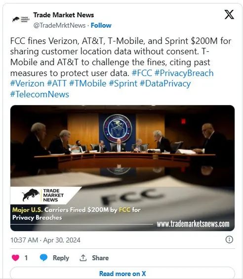 不过电信业者反驳有关指控,并明言打算对罚款提出上诉。营运商先前曾表示,共享数据被用于关键服务,包括路边援助和紧急应变等。AT&T发言人表示,FCC的命令缺乏法律和事实依据。T-Mobile发言人也表示,已于5年多前终止透过第三方定位服务分享有关数据,质疑罚款“过高”。