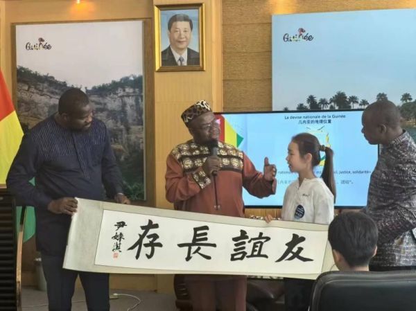 在几内亚共和国文化参赞精彩的介绍之后,大使馆工作人员为每一位到场的客人,赠送了他们精美的国家宣传册,以作珍藏。作为礼仪之邦,我们华夏儿女当然要礼尚往来,老师和学生代表纷纷为大使们送上了中国特色的礼物,其中一幅学生自己的书法作品《友谊长存》最能表达我们的美好愿景。祝愿中几关系蓬勃发展,祝愿两国人民友谊长存。