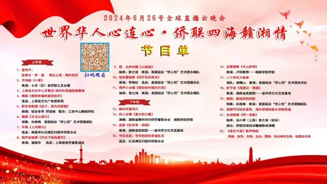 北京时间2024年6月26日22时(美国西部时间7时),“世界华人心连心·侨联四海赣湘情”2024暑假云晚会通过BILIBILI等网络平台向全球直播,向海内外观众宣传推介赣湘两省生态美景,送上地方特色文艺节目,展现四海侨胞一家亲的和美画卷。