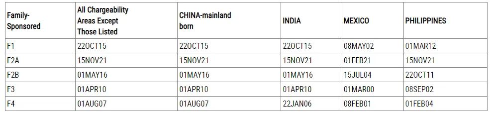 F2B类(永久居民的成年未婚子女,21岁及以上)原地踏步;