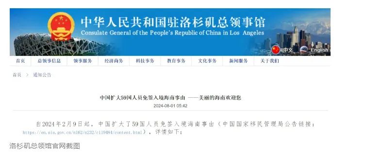 中国驻洛杉矶总领事馆8月1日发布通知公告,扩大59国人员免签入境海南事由。