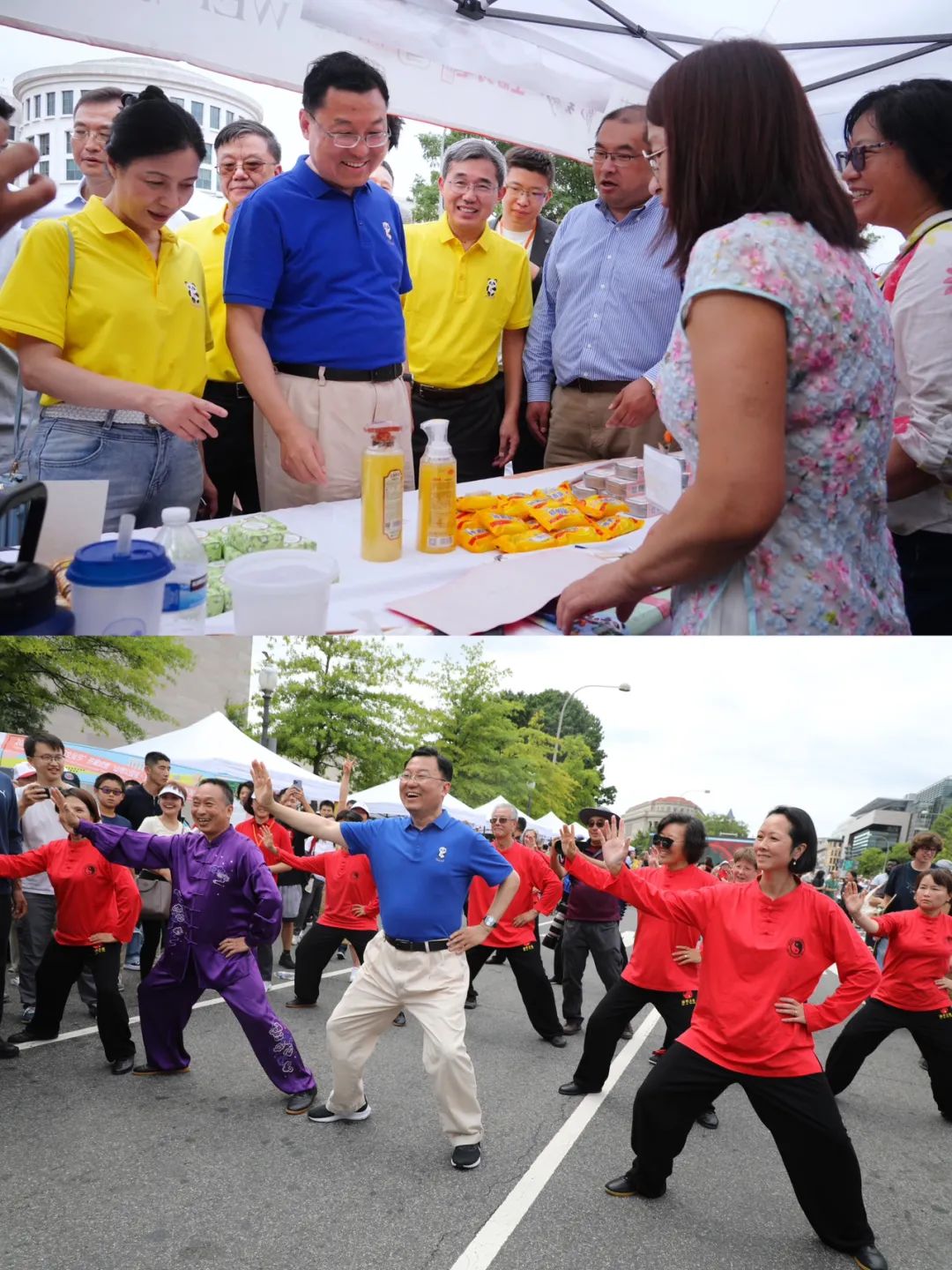 当天,当地近万民众争相驻足“打卡”。谢锋和夫人王丹融入现场人群,观看中国书法,观摩手工制作,学打太极,并同学习中文的美国学生交流。