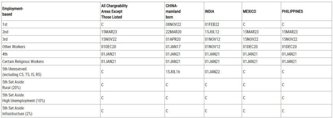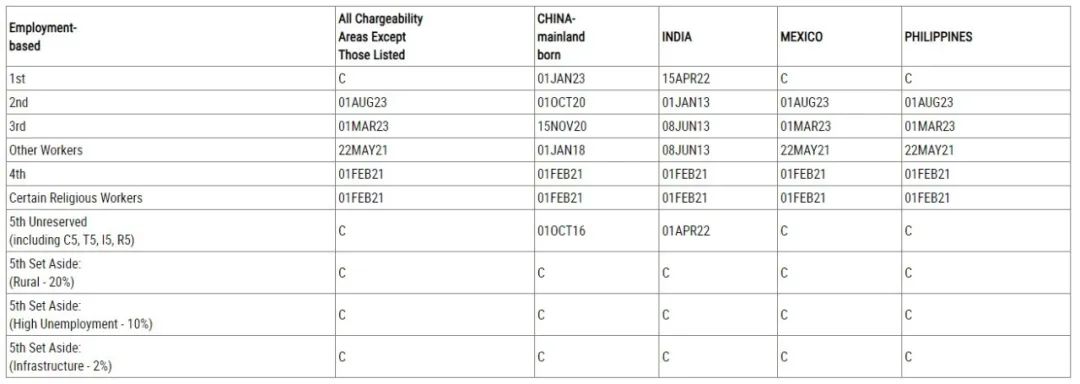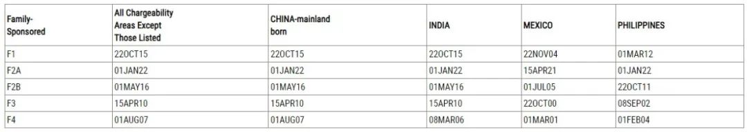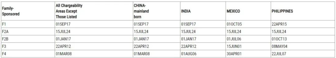 中国大陆出生亲属移民类审批排期(表A):