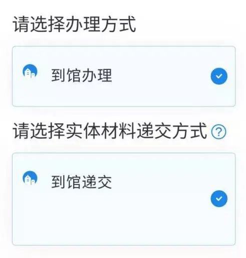 (二)选择办理方式。办理方式选择“到馆办理”,实体材料递交方式选择“到馆递交”。此处为默认选项,无法自行修改。