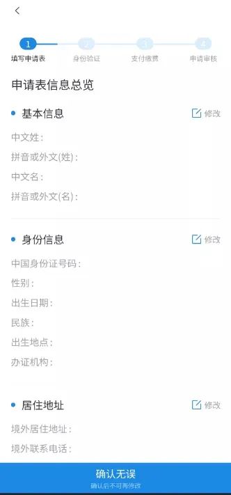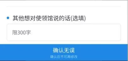 *如申请使用“线上申请+双向邮寄”办理模式,进入该环节点击“确认无误”前,请于页面最下方“其他想对使领馆说的话”栏目留言,说明无法到场理由。使领馆工作人员将据此调整办理模式。