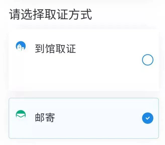 (三)选择取证方式。可选择“到馆取证”或“邮寄”。如选择邮寄发证,请提前准备清晰标注收件地址、付足邮资的回邮信封,随申请材料一并递交。